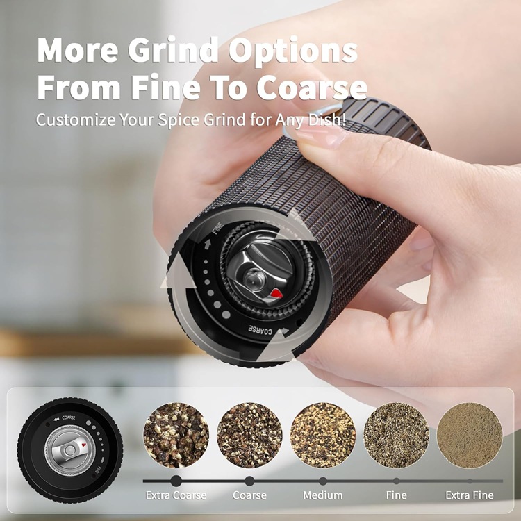 Adjustable Coarseness for Precision:Featuring 12 adjustable grind settings, this grinder easily meets diverse cooking needs. Fine grind is perfect for sauces, soups, and salads; medium for pizzas, pasta, and daily meals; coarse for roasts, steaks, and hearty ingredients—ensuring flavor is always just right.