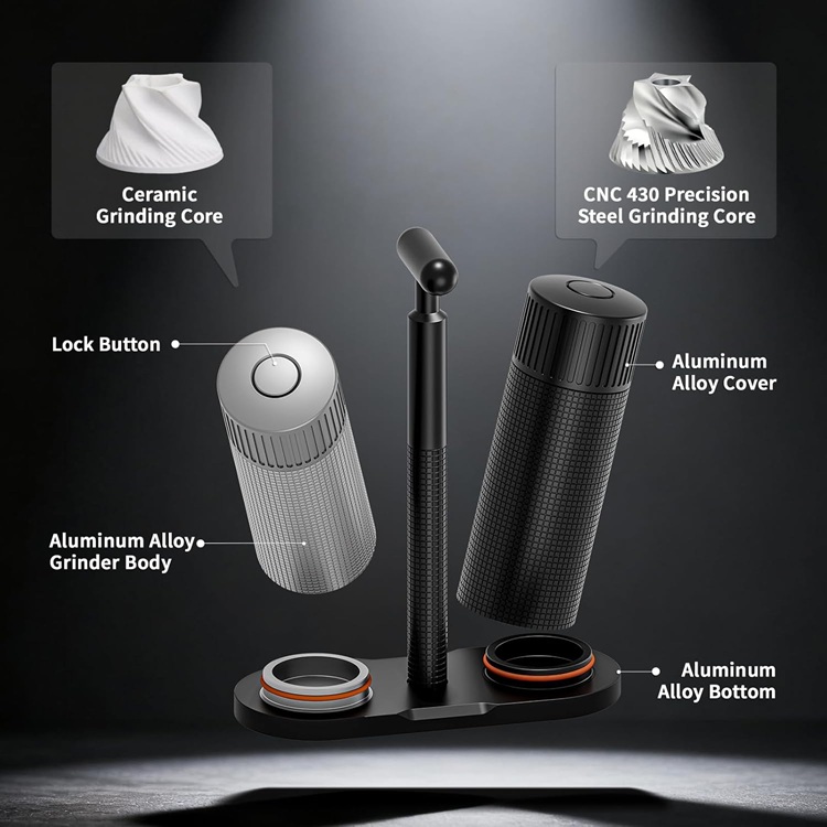 Premium Materials, Built to Last:The Pepper and Salt Grinder Set is crafted with high-quality materials for lasting durability. The body, lid, and base are made of sturdy aluminum alloy. The black pepper grinder features a CNC430 stainless steel grinding core and disc, specially designed for efficient pepper grinding. The silver salt grinder is equipped with a corrosion-resistant ceramic core, tailored for salt.