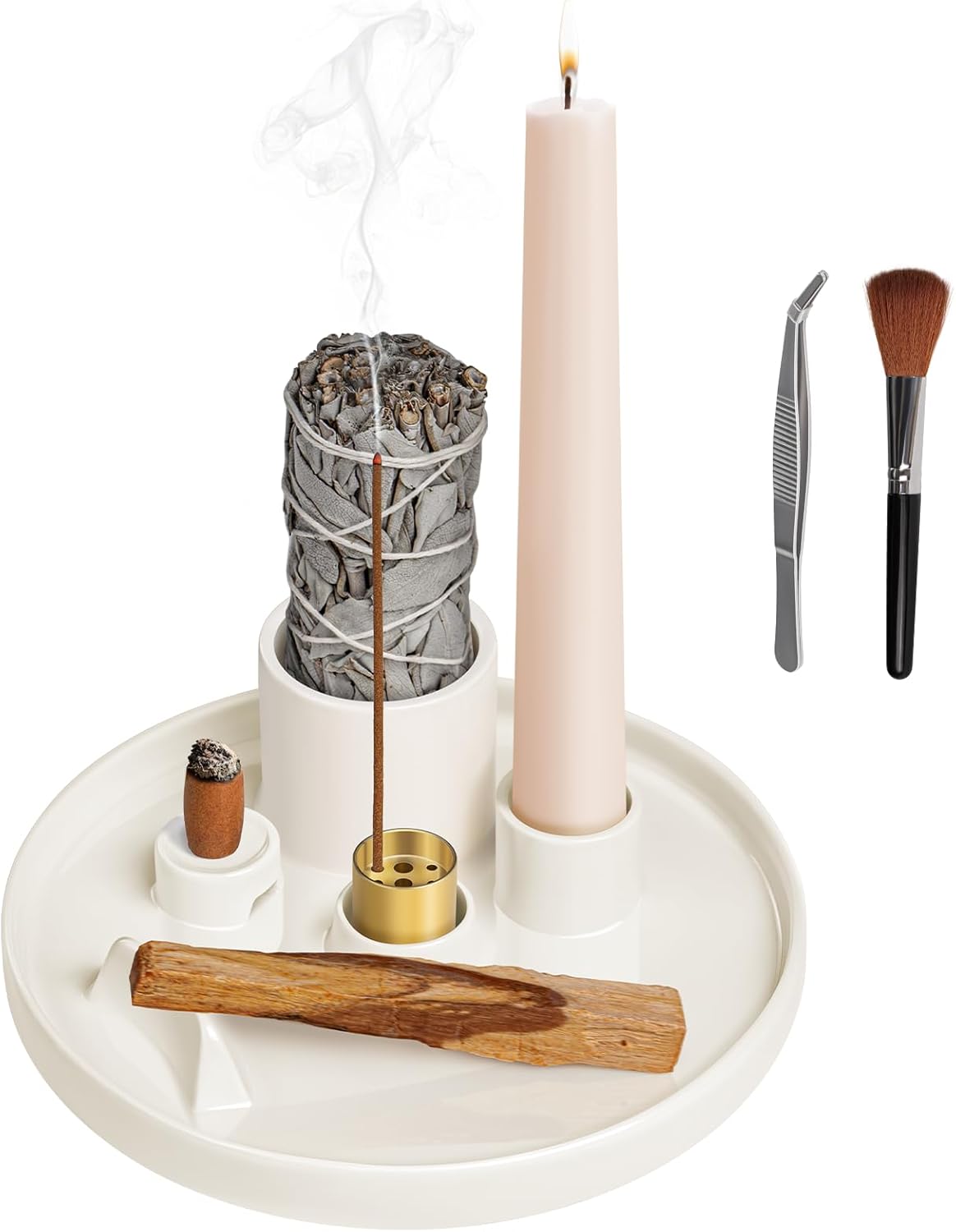 【5 in 1 Incense and Candle Holder】this multi-functional incense burner can be used as incense holder for sticks and backflow, palo santo burner, sage holder for burning and candle holder, can be compatible with most of incense sticks, candle, palo santo, and sage smudging bundles.